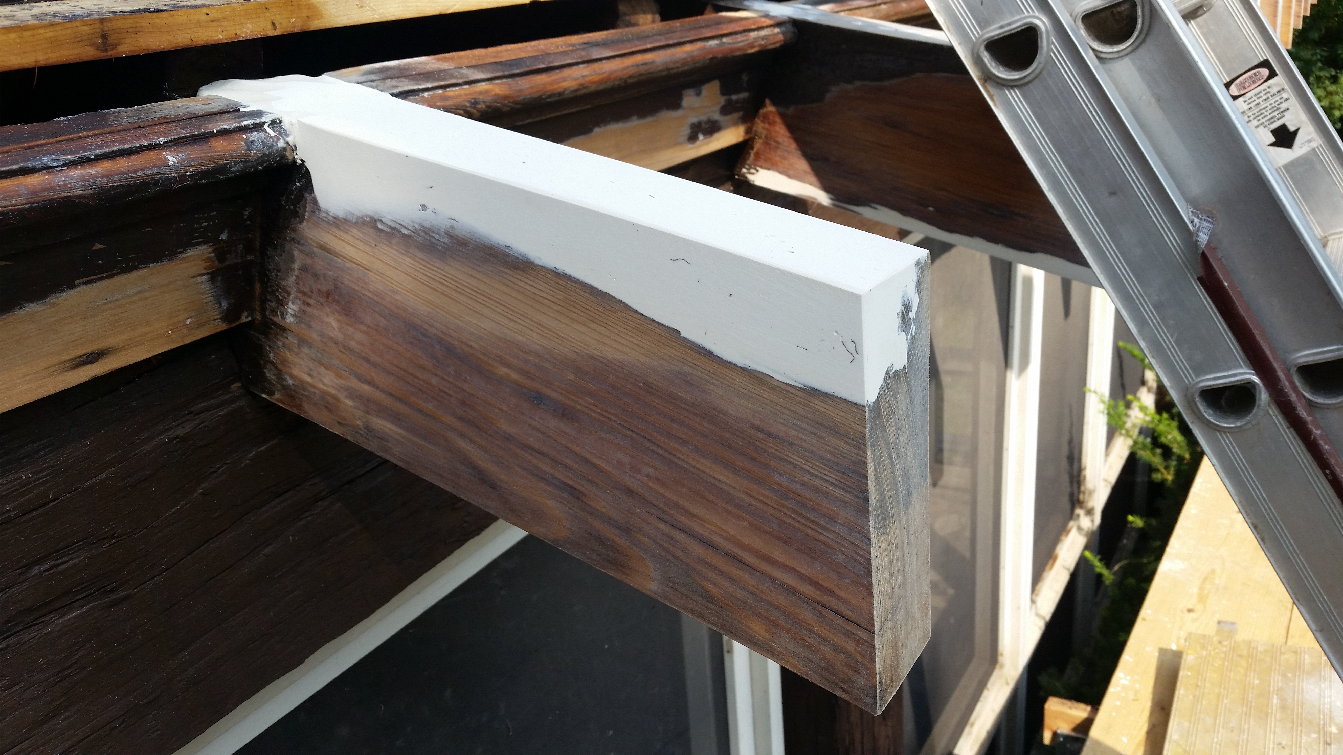 This roof joist was rotting and nearly impossible to actually replace. Instead, we sealed it with a 2 part epoxy and filled in the missing wood with a solid wood replacement product called Woodepox.