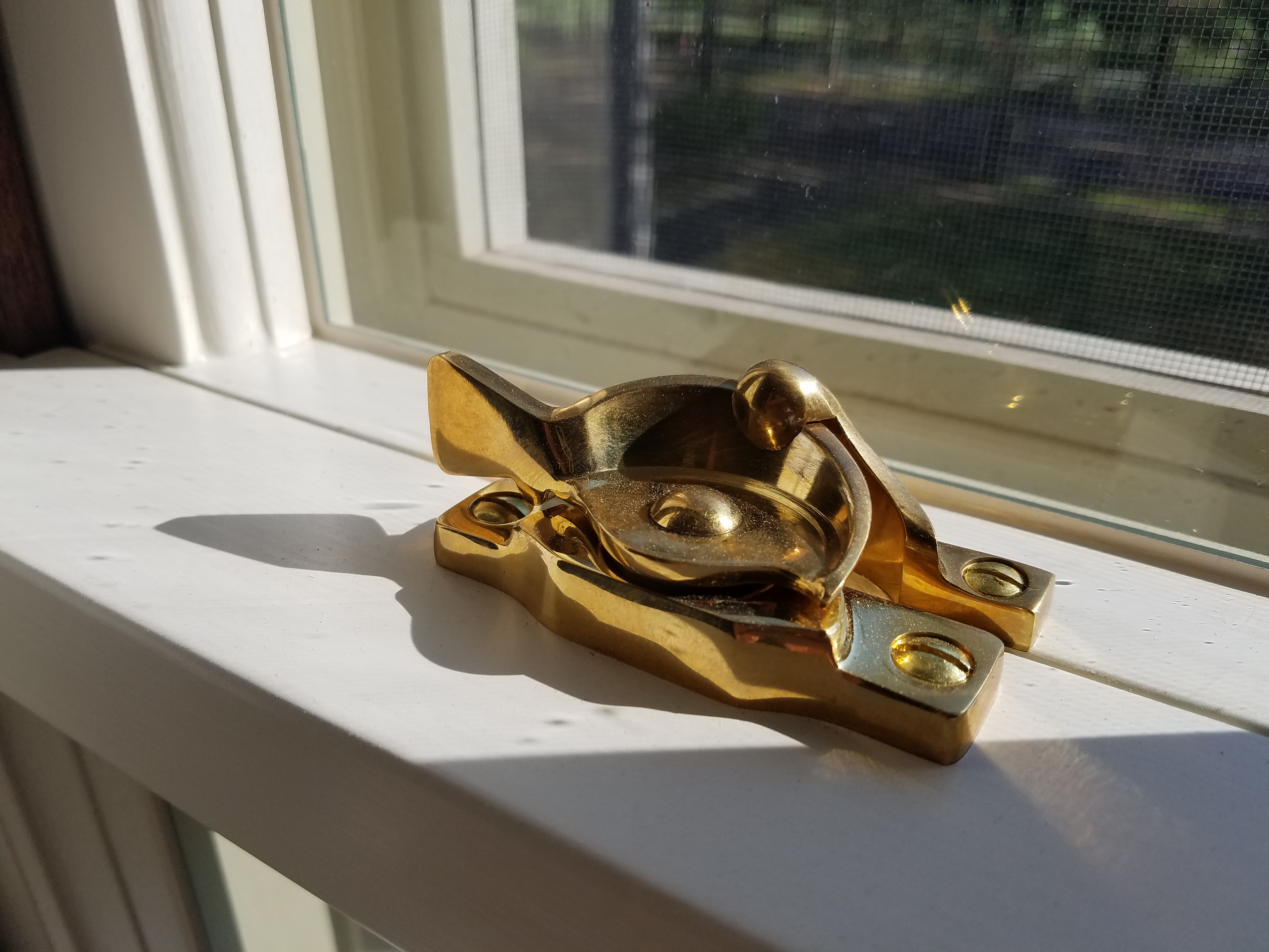 This is an example of a new solid brass lock on a historic, double-hung window.